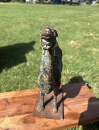 Antique cast iron camel, so cool!! Heavy. Would make great shelf or tabletop decor! It’s on top of a table in the photos, probably around a foot and a half but I can measure if needed!