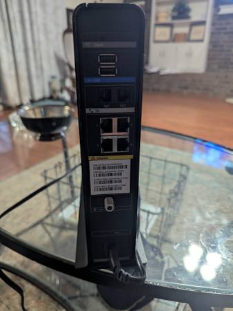 Includes power cable. Supports 2.4 GHz + 5 GHz WiFi, 4 Ethernet ports, and 2 telephone ports. Works great, buyer welcome to plug it in before they buy.