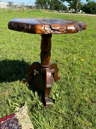 Vtg carved wood Spanish milking stool table, the top has some wear but it’d be really easy to sand down and re-stain. Cute for plants, side table, accent table, lamp stand, etc. 2 ft tall & 20” diameter.