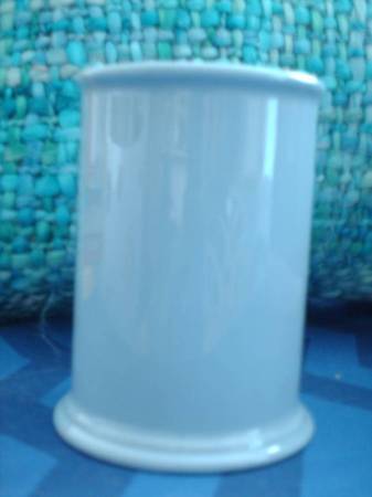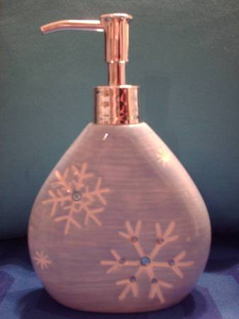 Blue with white snowflake round soap dish, $5.00. Blue with white snowflakes oval soap dispenser, $6.00. Blue with white snowflakes round soap dispenser, $6.00. Blue cup, $3.00. Blue Laura Ashley...