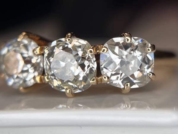 Stunningly beautiful Antique Past, Present, Future; 3 stone Engagement, or Wedding Ring. Stamped to the interior of the band and tested as 14 carat yellow gold. In excellent antique condition, ready to adorn a new finger with its graceful charm. We have included close up magnified photos so that you can better see the details of this delightful treasure. We adore the delicate prongs of this ring and the pillowy cut of the diamonds. The size is approximately 6.5 - exact measurement is not possible due to sizing stops added to the inside to prevent ring spinning. Easily sizeable. A recent professional appraisal for $14950.00 is included so that you may obtain insurance on your new heirloom ring.