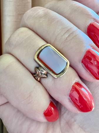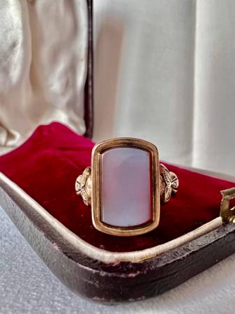 Genuine Yellow Gold Carnelian signet ring from the Victorian era (1837-1901). The top panel in which the stone sits measures 15.45mm long by 10.64 mm across. Bezel set on top is an rounded corner rectangle cut Carnelian stone with a white onyx top. The ring is a size 6+ (over the 6 mark just above the 6.25 mark) and can be re-sized, there is evidence of sizing in the past. Inquire for a quote to resize, the turnaround time is approximately 3 weeks for sizing. This is a solid weighty ring at 4.77 grams. It is unmarked for gold content as typical for American made pieces of the time, it has been both acid and electronically tested and reads between 10k and 14k depending on the spot tested. Please note there are deep testing marks to the underside of the ring, not visible when worn in addition to wear marks at the corners of the underside of the ring. There is natural patina present on the ring from the aging of the alloys used in the gold mixture. I have left it to the buyer to decide if they would like to polish these signs of age away. I will polish the ring for no additional charge if desired, please allow 3 business days for polishing. This signet ring was made for a lady with lovely detailing on the shoulders and around the band. It is impactful without being bulky and a beautiful example of the period.