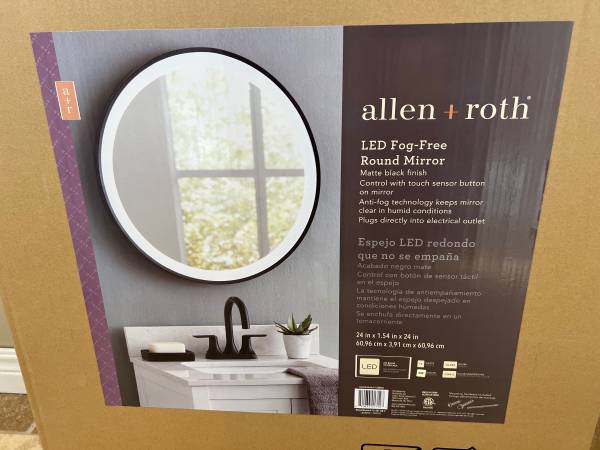 Brand new in box. 24-in W x 24-in H LED Lighted Matte Black Round Fog Free Bathroom/Wall Vanity Mirror.
